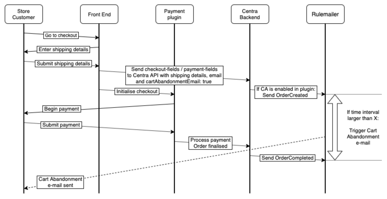 orderCreated, that starts a countdown to a pre-defined time interval for this shopper, - In the meantime, the store customer proceeds to payment, this is the step that might be interrupted.