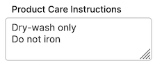 "text": { "desc": "Product Care Instructions", "type": "textarea" }