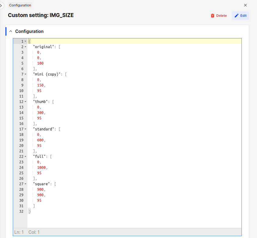 New config: Please note, that there are some predefined image sizes that you cannot delete. These are used by the system and are required to be present. You can edit them.