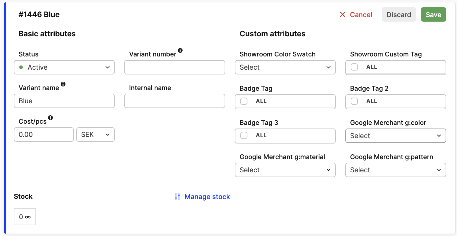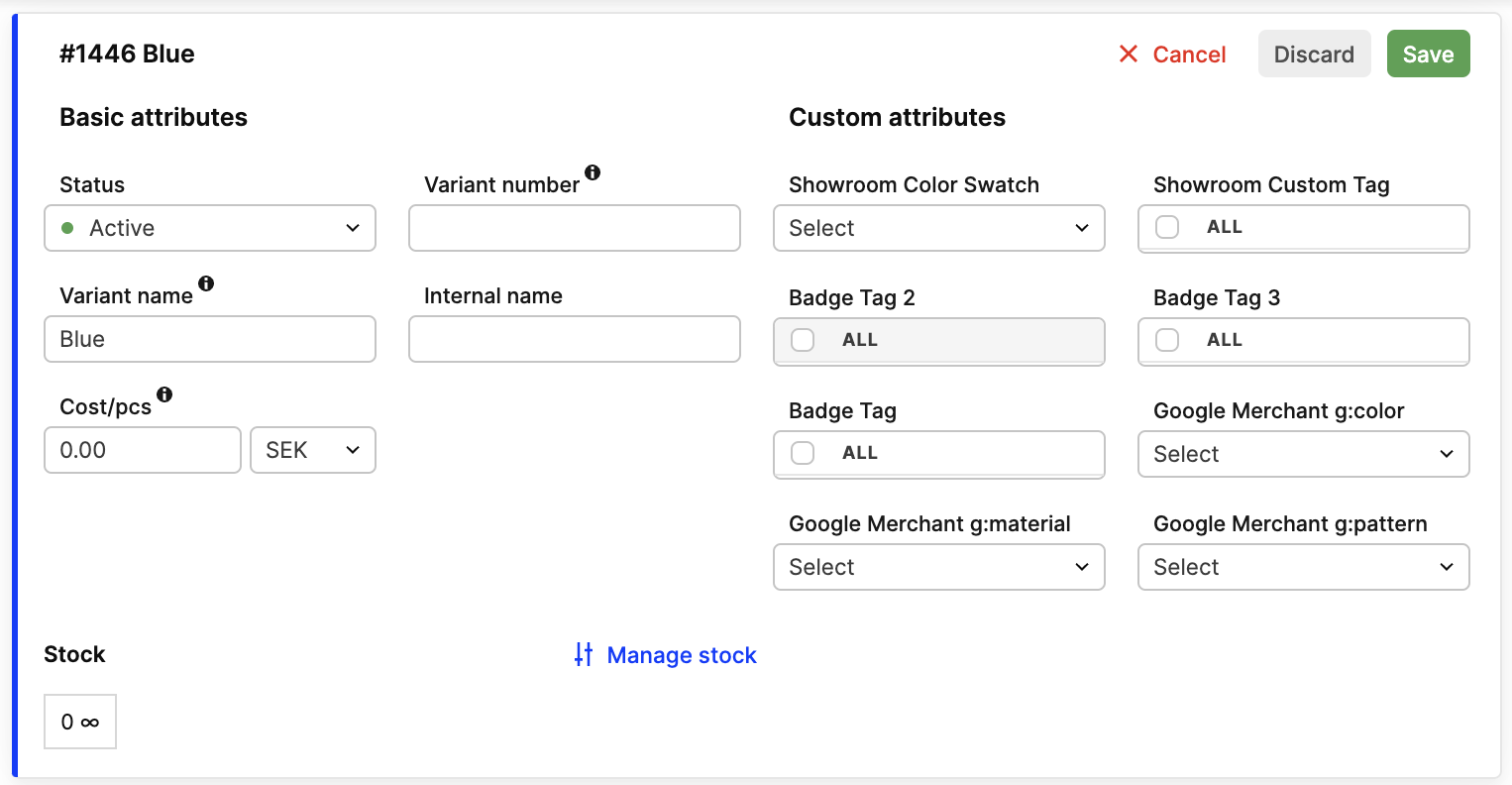 When this attribute is saved, this attribute option will be listed under the Color Swatch-title in the variant-section of the product: